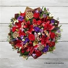 Scarlet wonder featuring: red lily, red rose, red carnations, pink astrantia, purple lisianthus and clematis finished with lutus and cinnamon.